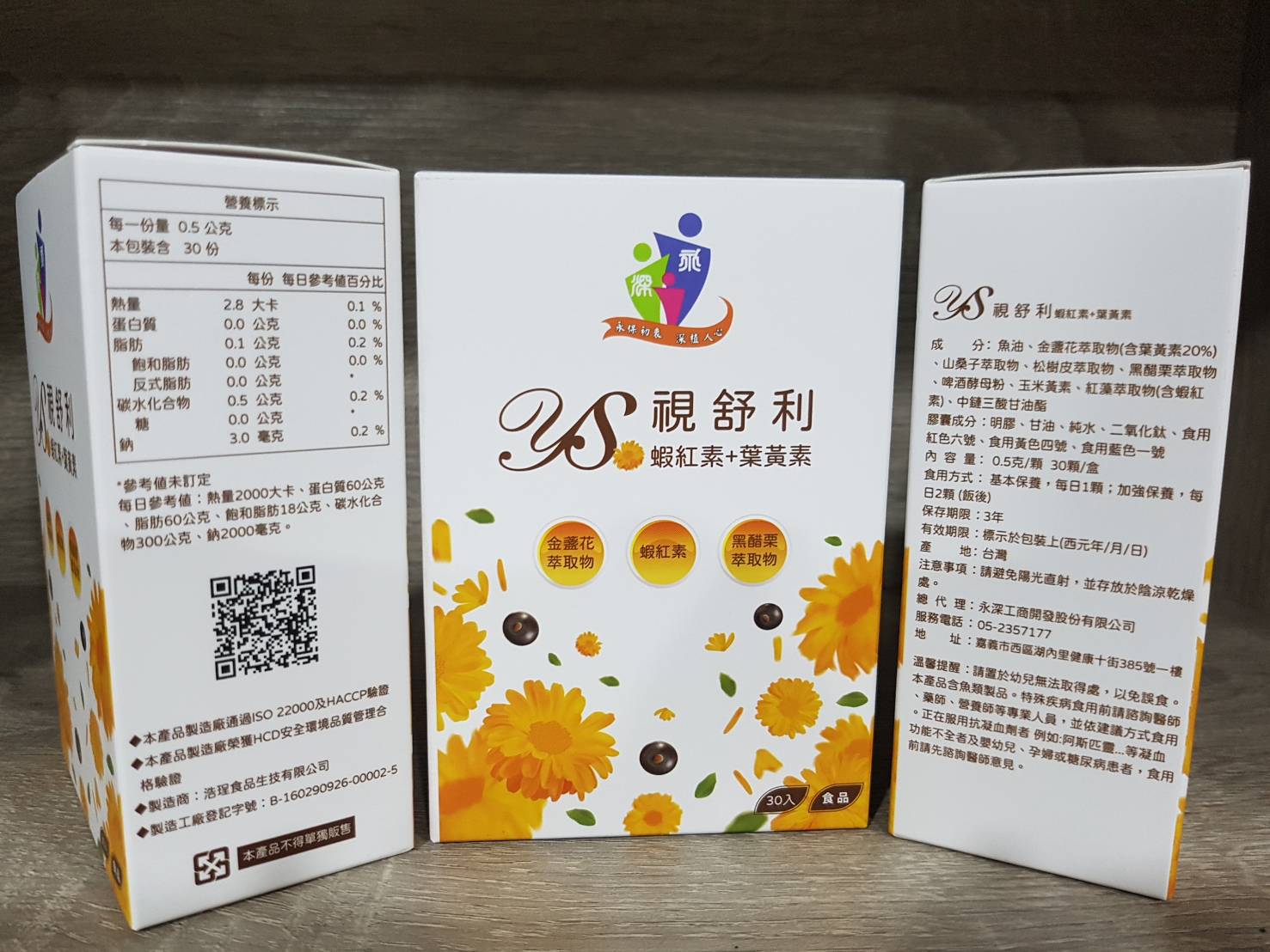 蝦紅素+葉黃素:視舒利,內含金盞花萃取物(含葉黃素20%)、魚油及紅藻萃取物(含蝦紅素)等成份。